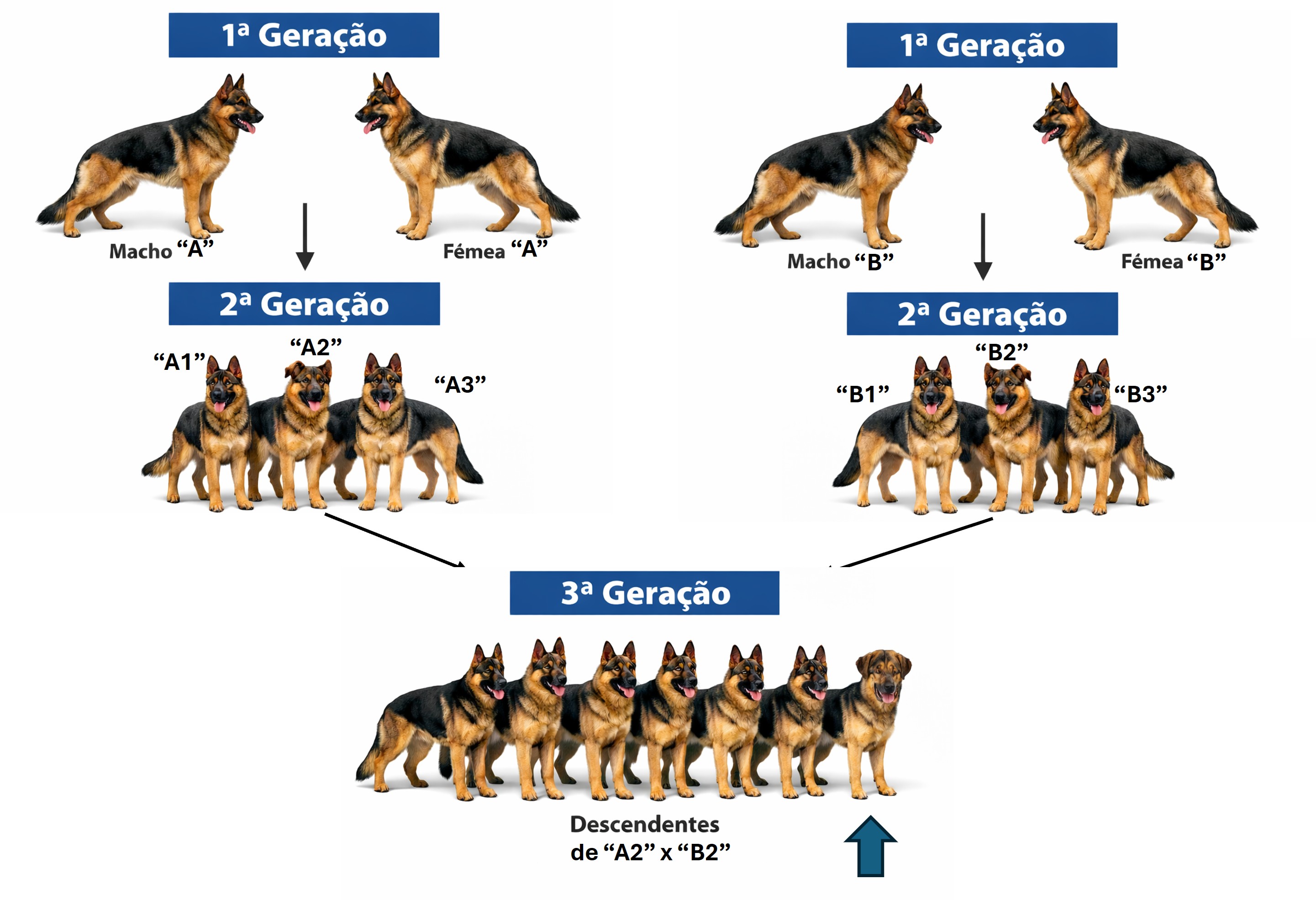 No próximo abaixo, veja que se este criador ignora que um de seus cães tem esta falta/falha, e opta por reproduzi-lo, o defeito físico irá se perpetuar, e pode, inclusive ficar mais evidente, dependendo com que tipo de cão este primeiro foi reproduzido. No exemplo utilizado, o criador possibilitou que este cão nascido na 2ª geração (“A2”) fosse reproduzido com outro que tinha uma falta física similar (“B2”).