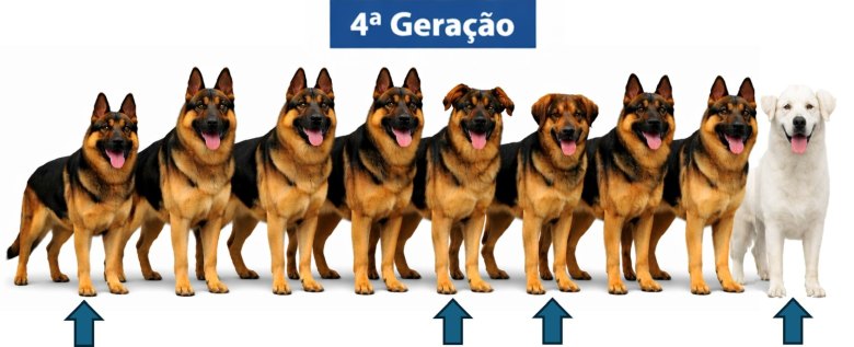 Para se chegar ao ponto de, por exemplo, produzir um filhote com uma cor fora do padrão (como o branco do filhote da direita mostrado na 4ª geração), ou um filhote menor do que o tamanho padrão da raça (como o filhote da esquerda mostrado na 4ª geração), além de cães com faltas “menores” como a orelha caída (como o 5º e o 6º cães), que não foram resultados de mistura com outra raça. Desta forma, nem sempre cães fora do padrão são originados de miscigenação de raças. Muitas vezes, estes cães existem apenas porque o responsável pela reprodução dos cães não era um verdadeiro criador, e simplesmente deixou que os cães se reproduzissem de forma aleatória e sem seleção ou direcionamento, o que é função principal de um criador responsável! Por último, lembre-se que é provável que a rapidez com que as faltas surjam e se pronunciem não seja tão grande como o demonstrado neste texto, que teve o objetivo de explicar o processo em poucas gerações, para simplificar. Uma situação mais realista ocorreria com faltas pequenas ocorrendo e se pronunciando ao longo de várias gerações, certo?